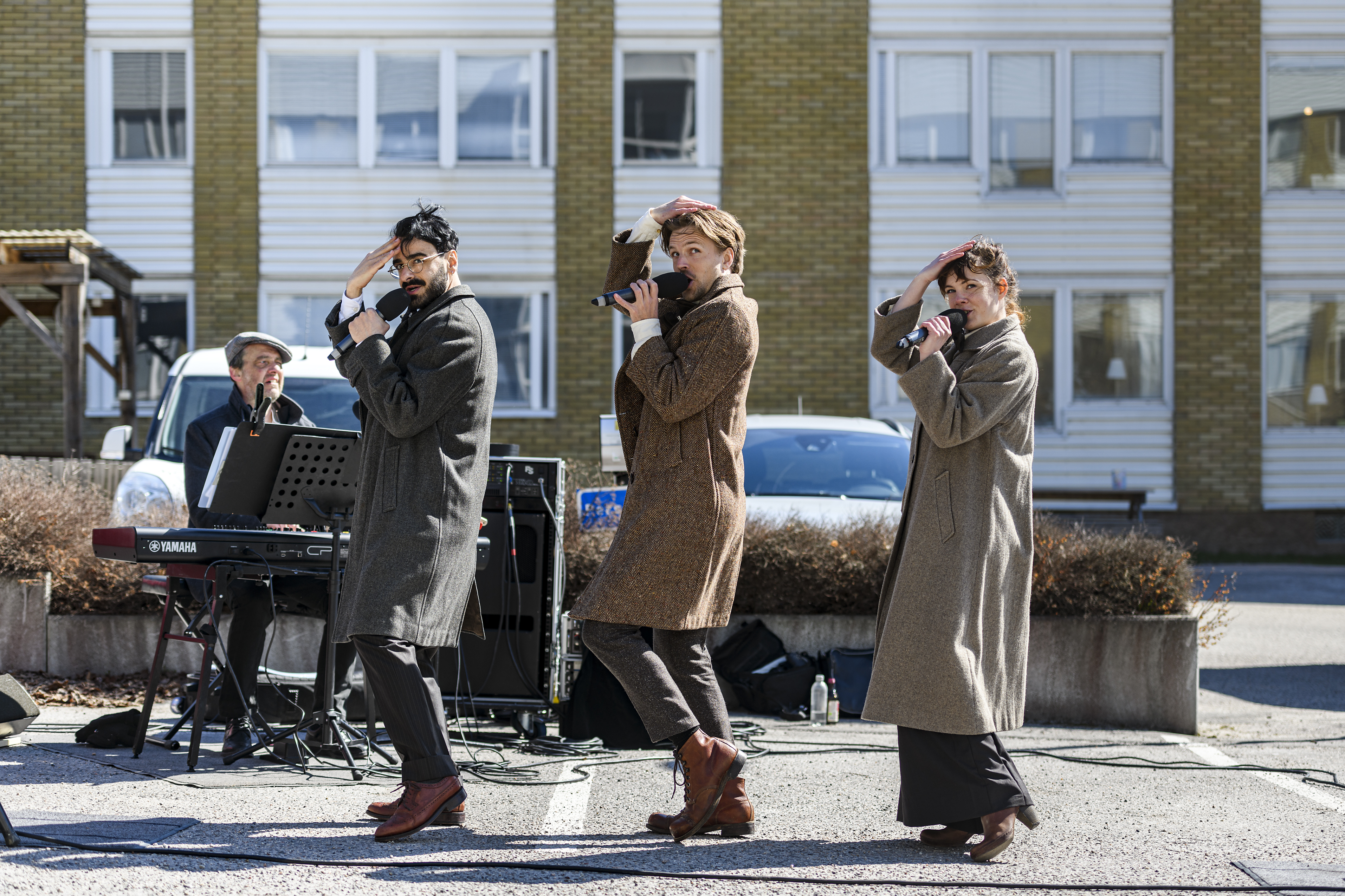 Tre musikalartister och en pianist och spelar utomhus och mottagandet från äldreboendena har varit entusiastiskt.